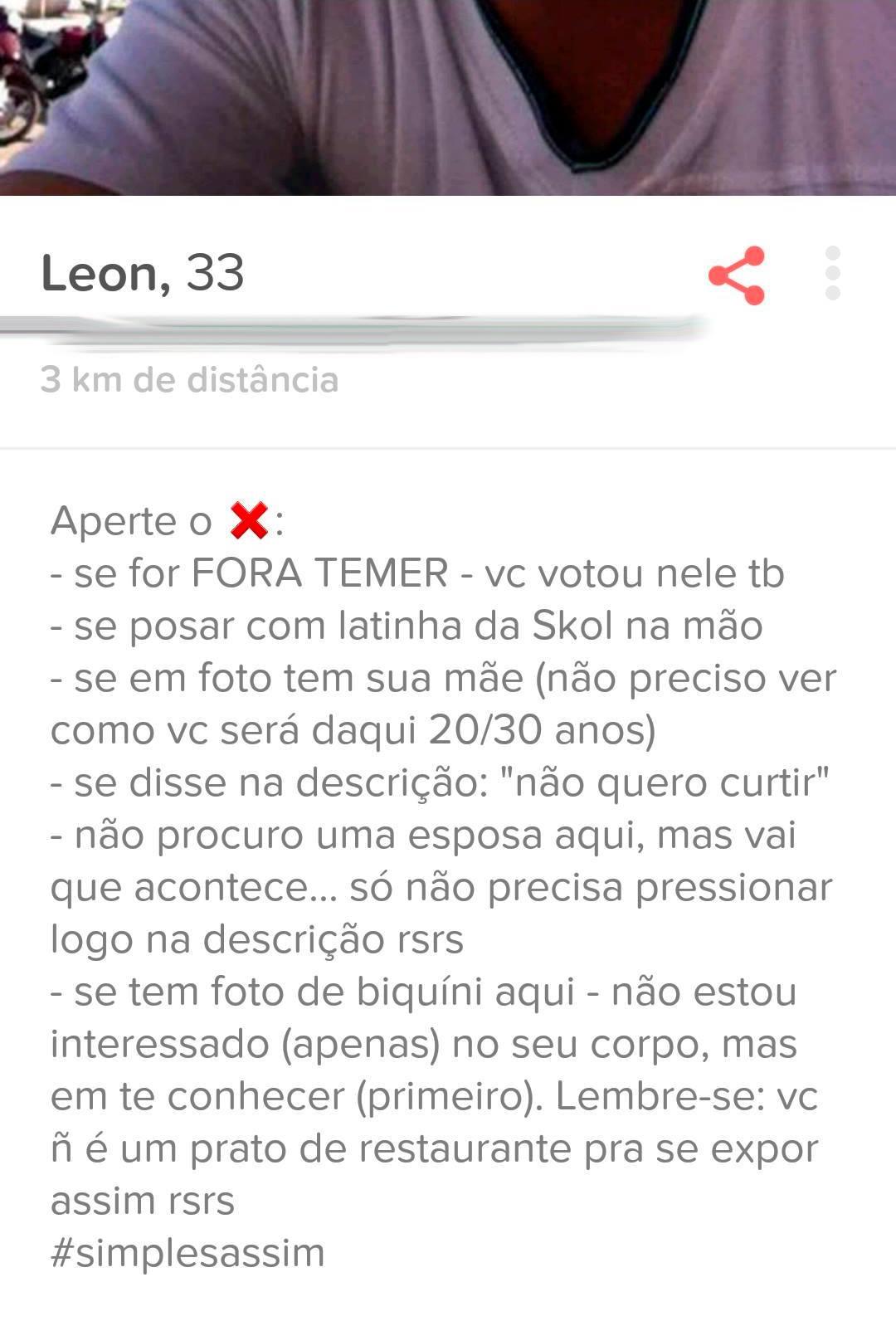 O Tinder tem a opção de uma breve descrição no perfil para se apresentar melhor aos usuários do app. O que para alguns parece a oportunidade ideal para discorrer sobre política, religião, como deve ser o homem/mulher perfeito e qualquer assunto que possa envolver um textão digno de Facebook.