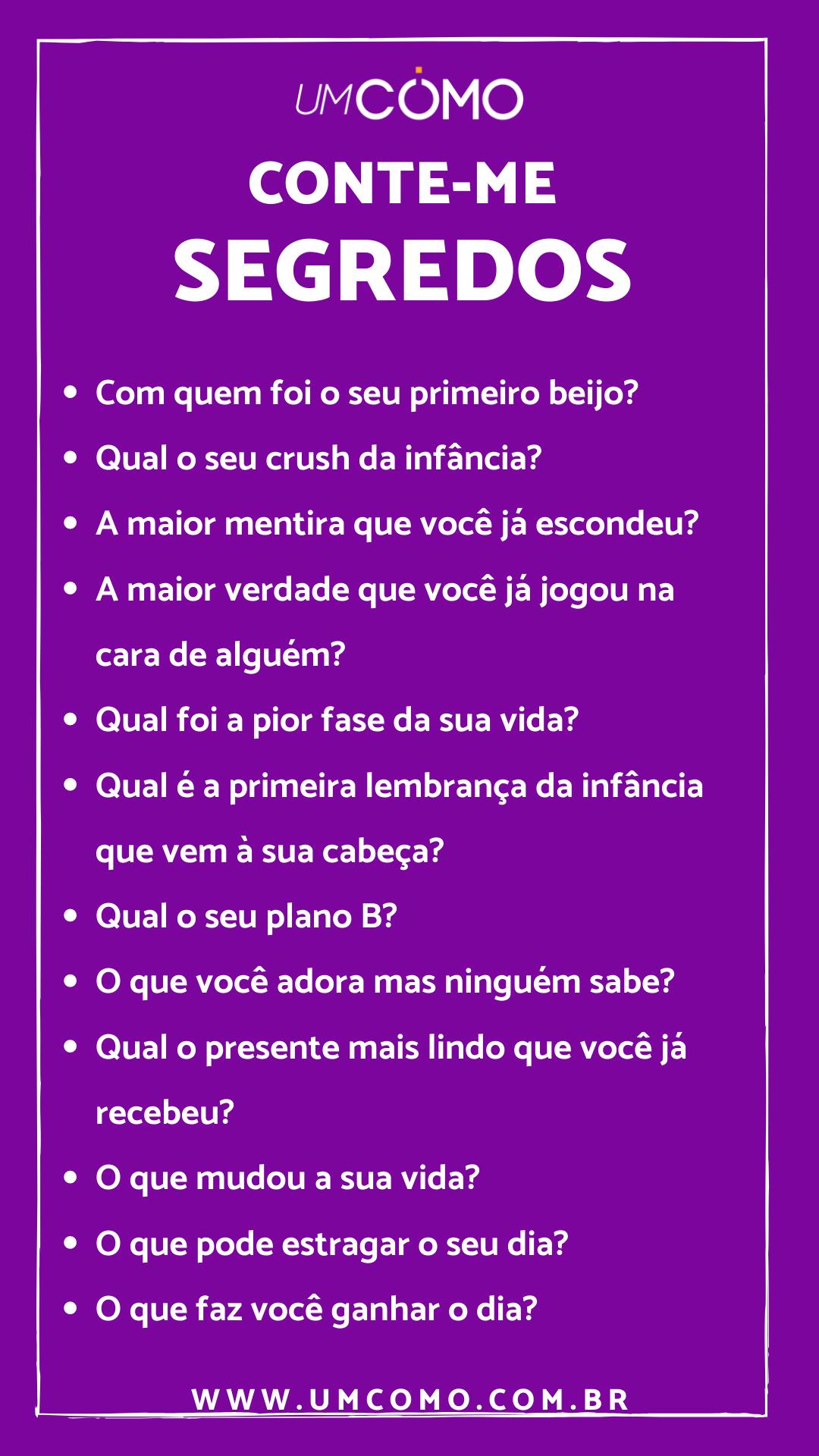 Também funciona se você decidir falar sobre quando ou com quem foi o seu primeiro beijo ou primeira vez. Para funcionar, o segredo do jogo está em revelar coisas que nunca foram ditas para a outra pessoa.