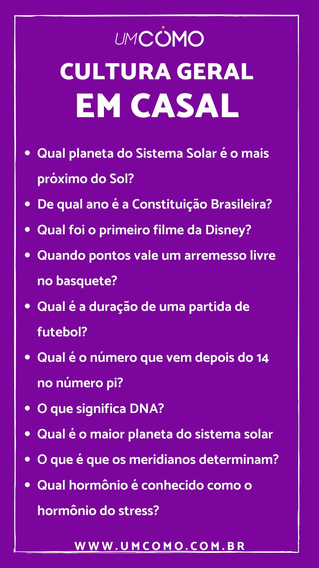 Este jogo de perguntas para casal é um pouco diferente, pois engloba apenas questões focadas no dia a dia daquele casal, no tema romance e na convivência a dois. A intenção, com essa brincadeira, é não só aproveitar o tempo com o outro, mas também conhecer um outro lado do seu parceiro ou parceira. Você pode perguntar sobre relacionamentos passados, sobre aprendizados relacionados ao amor, fazer reflexões a dois... além de fazer o casal dar boas risadas, o jogo também contribuirá para que vocês se conheçam cada vez mais.