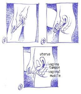Com a outra mão, abra os lábios (as dobras ao redor da entrada da sua vagina) e coloque a ponta arredondada do aplicador na entrada da sua vagina, em direção às suas costas. Lembre-se que a vagina se estende para trás, em direção a sua coluna (não para cima). Ver imagem 1.