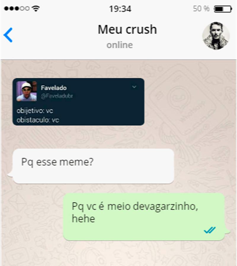 - MEMES: o fantástico mundo dos memes pode te salvar com classe daquele momento em que o assunto acabou ou que o cara nunca mais te respondeu. Muito cuidado com piadas ofensivas. Você mesma pode criar um meme de uma foto.