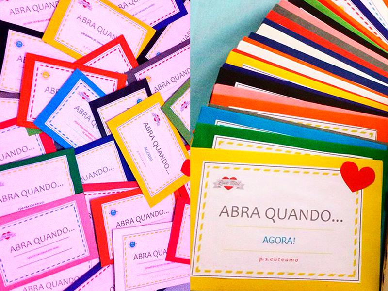 Ainda na vibe das cartas, uma ideia fofa é um conjunto de cartinhas "abra quando". Ao invés de enviar somente uma carta, você prepara várias, para diferentes momentos e escreve no envelope o momento em que elas devem ser abertas: "abra quando estiver com saudades", "abra quando quiser ler uma história bonita", "abra quando estiver triste"...