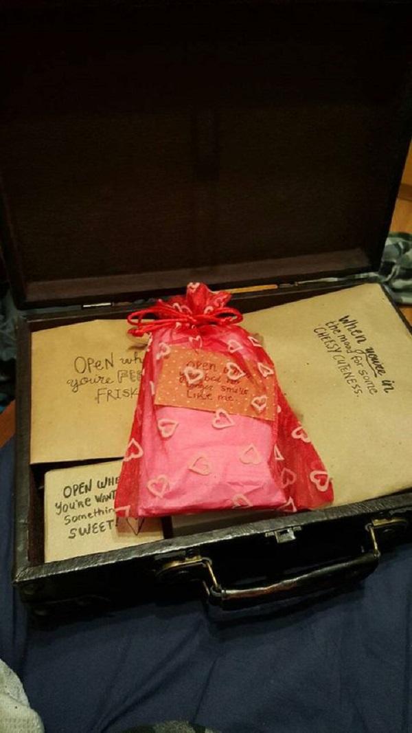 Se o frete para enviar uma caixa para o destino do seu namorado não é tão caro, você pode usar a ideia do "abra quando" com presentinhos em caixinhas ao invés das cartas. Prepare caixinhas com mimos para momentos específicos como guloseimas, sabonetes e outras coisas que você sabe que a pessoa vai curtir.
