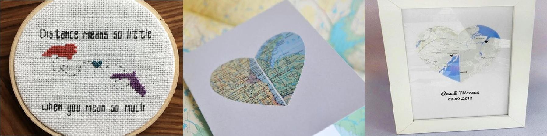 Nem só de cartas e caixas vivem as encomendas do correio e as ideias de presentes para namorado à distância. Você pode apostar em quadrinhos fofos feitos por você mesmo que além da distância e do carinho servem para decorar o ambiente. Use o tema "mapas" e brinque com as localizações. Você encontra moldes e tutorias online para diferentes modelos como em bordado, com colagem de mapas e outras ideias.